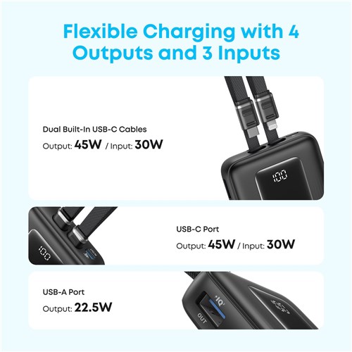 With 45W high-speed charging. you can boost an iPhone 16 to 57% or a Samsung S24 to 55% in just 30 minutes.