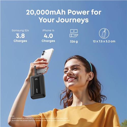 Power through your day with the 20.000mAh capacity. offering 4.04 charges for an iPhone 16 or 3.82 charges for a Samsung S24.
