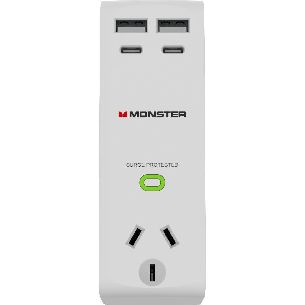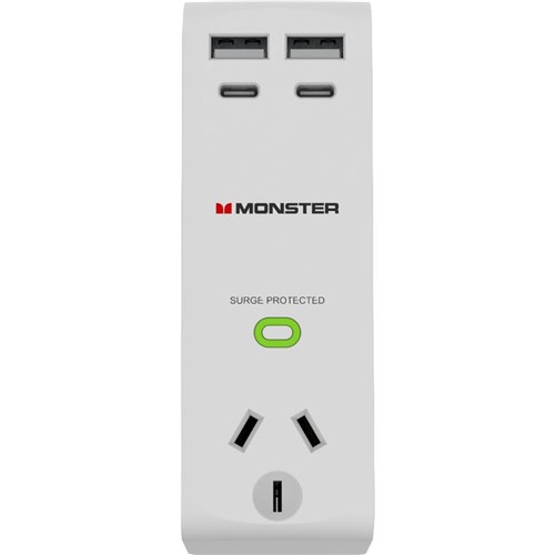 Introducing the all-new Monster Single Outlet Surge Protector with 2 x USB A & 2 x USB C Fast Charging Ports! This powerful surge protector is designed to provide ultimate protection for your mobile devices. while also giving you the convenience of fast charging. With its LED surge indicator light and fireproof technology. you can rest easy knowing that your devices are protected against power surges and spikes. Plus. the surge protector has a $10.000 connected equipment warranty. so you can have peace of mind knowing that your devices are covered in case of any unforeseen accidents. The two USB A and two USB C fast charging ports are perfect for charging your mobile devices quickly and efficiently. Whether you're at home. in the office. or on the go. this surge protector has got you covered. So why wait? Protect your devices and enjoy fast charging with the Monster Single Outlet Surge Protector with 2 x USB A & 2 x USB C Fast Charging Ports today!