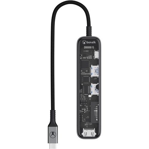Built to last! The Bonelk Vision USB-C to 6in1 Multi-Port Hub combines sleek. modern styling with powerful connectivity. Featuring a crystal clear top and base with a premium aluminium finish. it delivers 4K 60Hz HDMI output. USB-C PD 100W. SD/Micro SD ports and two USB-A 3.0 ports to expand your devices capabilities. Built for everyday use. it includes a long-life braided nylon cable with Flex-SR™ strain relief for exceptional durability at work. at home. or on the go.