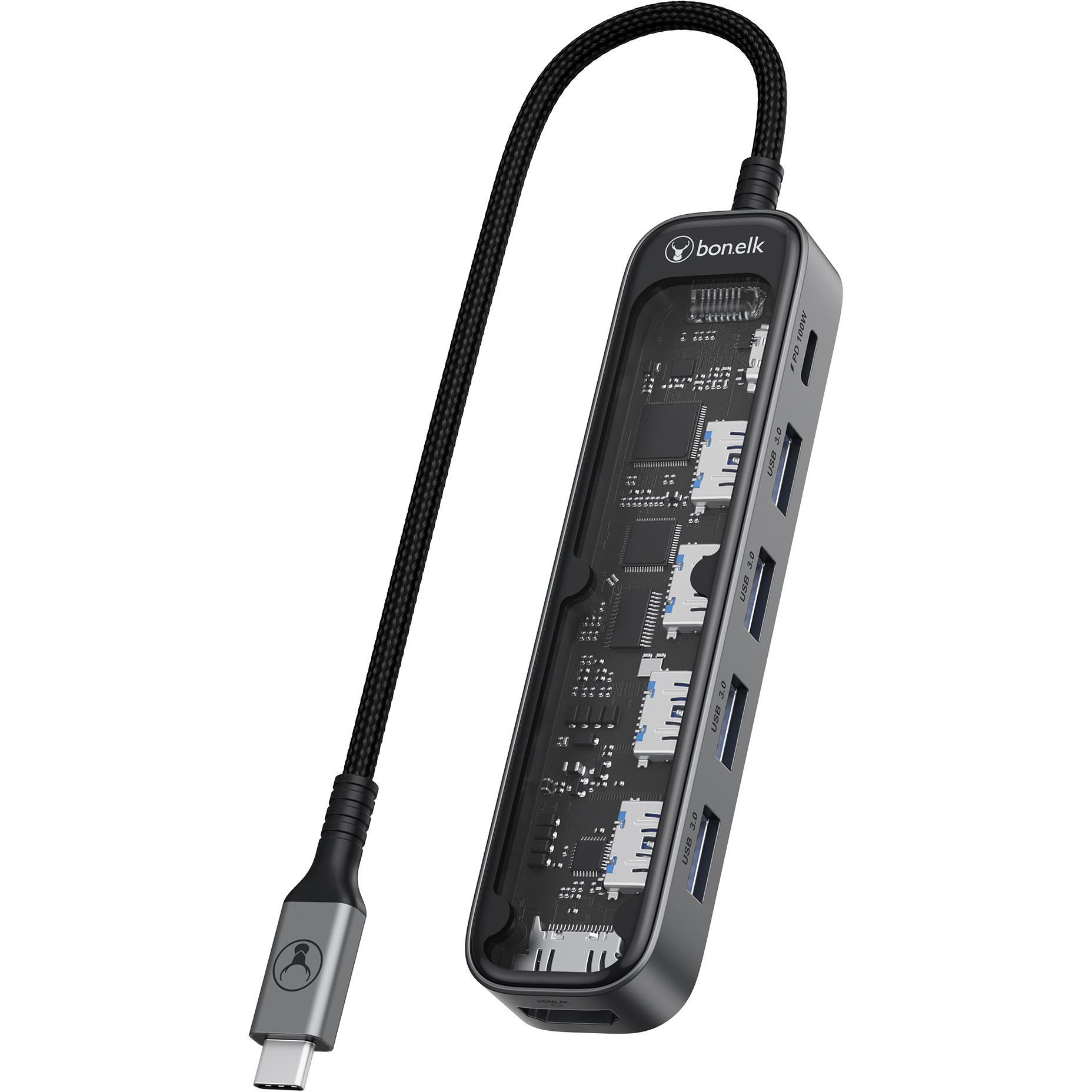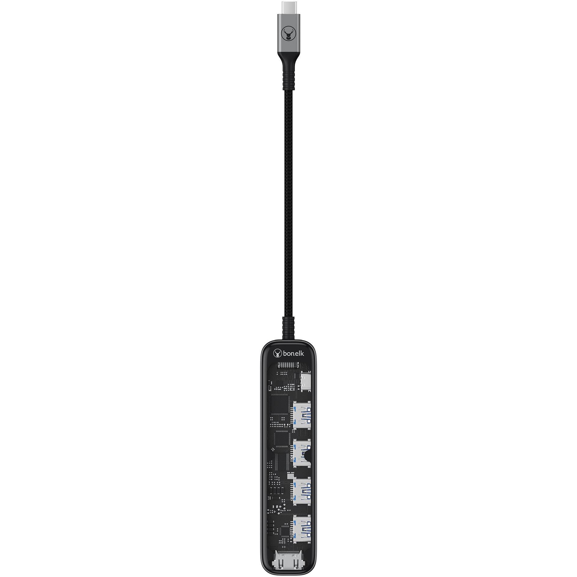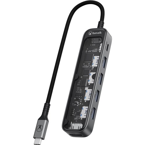 Built to last! The Bonelk Vision USB-C to 6in1 Multi-Port Hub combines sleek. modern styling with powerful connectivity. Featuring a crystal clear top and base with a premium aluminium finish. it delivers 4K 60Hz HDMI output. USB-C PD 100W. and four USB-A 3.0 ports to expand your devices capabilities. Built for everyday use. it includes a long-life braided nylon cable with Flex-SR™ strain relief for exceptional durability at work. at home. or on the go.