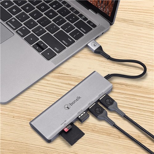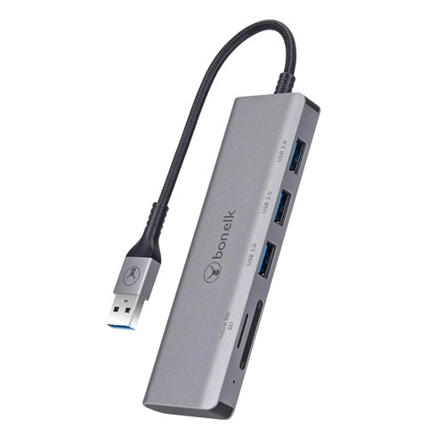 The Bonelk USB-A to 3 Port Hub + Micro SD/SD is a great solution to connect up to 3 additional USB-A high speed devices to your laptop. smart device or desktop computer plus micro SD and SD memory card data transfer. Built using high quality materials and intelligent electronics. Features 3x USB-A 3.0 female ports that support 5Gbps transfer speeds. 1 x SD data port and 1 x Micro SD data port. Complete with a durable Long-life cable with braided nylon jacket and FLEX-SR™ strain relief.