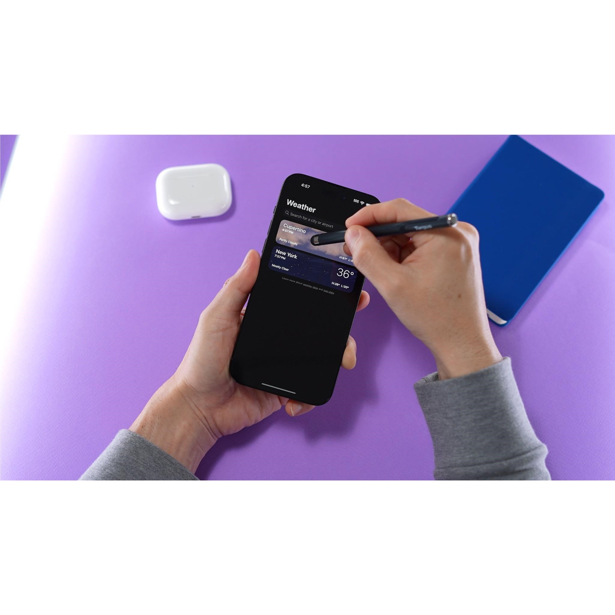 Functional stylus to minimise physical contact when sharing touchscreen devices. whilst Targus® DefenceGuard™ Antimicrobial Protection technology* works continuously to prevent growth of microorganisms on your stylus.