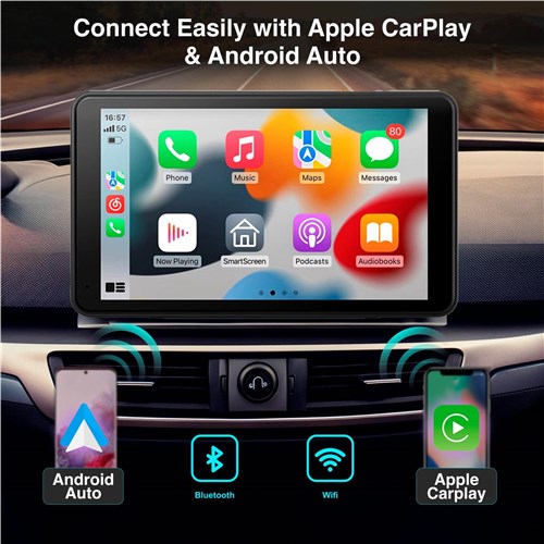The Laser 7' Portable Apple CarPlay/Android Auto Touchscreen brings Apple CarPlay and Android Auto technologies to any vehicle. offering convenience. safety. and functionality. It integrates with your car. keeping you connected and entertained while on the road. With voice assist commands. you can send messages. make phone calls. or select your favourite music tracks without taking your hands off the steering wheel.