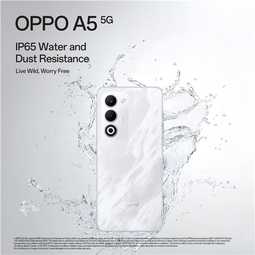 1. OPPO A5 5G supports IP65 waterproof and dustproof rating. which can prevent splashing. water. and dust in normal use. Under controlled laboratory conditions. it has been tested to meet the IP65 level according to GB/T 4208-2017 (China) / IEC 60529 (International) standards. The IP65 waterproof conditions are as follows: (1) Nozzle inner diameter 6.3mm. distance 2.5-3m. water flow rate 12.5L/min; (2) Test time not less than 3 minutes; (3) Water temperature should not differ from the product temperature by more than 5?. The splash-proof. waterproof. and dust-proof functions may decrease due to daily wear and tear. Please do not charge the phone in a damp state. Damage caused by immersion in liquids is not covered by the warranty.
