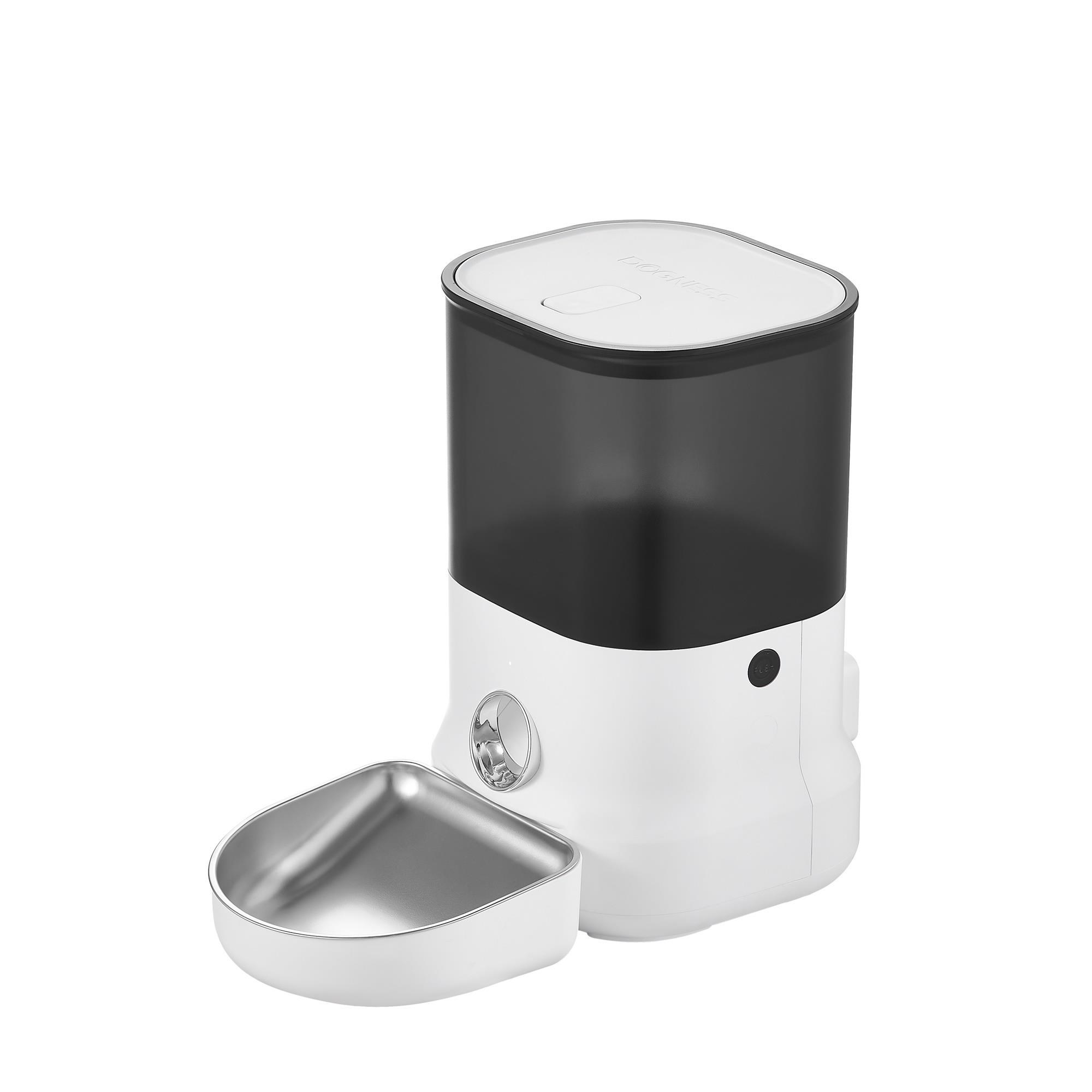 The Dogness Cube Programmable Pet Feeder for Dogs and Cats holds up to 4 litres of dry food. Program up to 4 meals a day and 1 to 39 portions per meal.