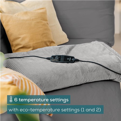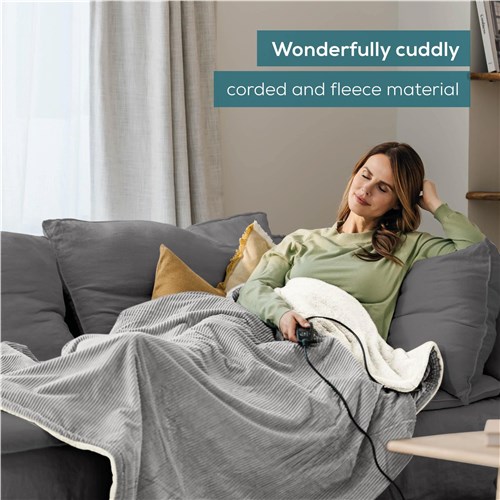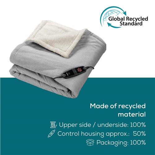 Enjoy cosy moments with the Beurer HD81 Heated Blanket in light grey. This electric blanket made of fashionable corded fabric not only provides soothing heat. it is also sure to become a stylish highlight in your living room. The use of recycled materials protects the environment without compromising on Beurer’s tried-and-tested quality. Perfect for snuggling up and relaxing!