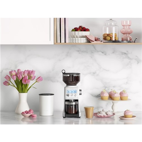 Breville's conical burr Smart GrinderTM uses Dosing IQ technology to automatically adjust the dose whenever you change the grind. Choose between 'cups' for French press or Filter. and 'shots' for Espresso to get the right dose for your coffee's needs. You can even tweak for taste.