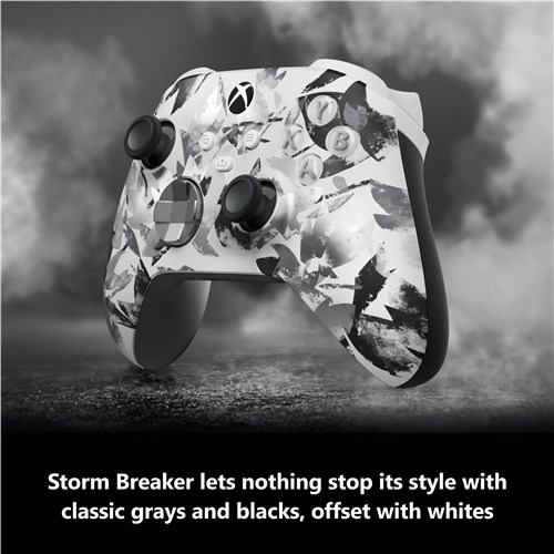 Hold nothing back with the Breaker special edition series. Storm Breaker lets nothing stop its style with classic grays and blacks. offset with whites. Stay elegantly on target with textured triggers. Hold on to the action with rubberized grips on the back cases. Quickly pair with. play on. and switch between devices including console. PC. and cloud.*