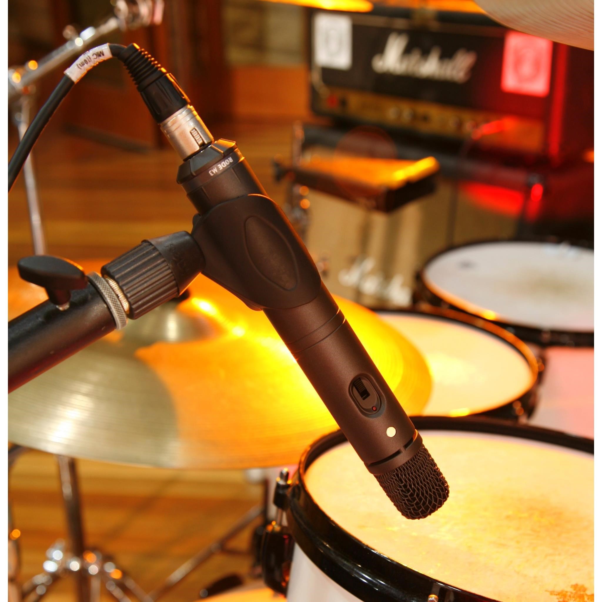 The Rode M3 is a highly versatile end-address condenser microphone. designed to be completely at home in the studio. on stage or on location. It is equally suitable as an instrument microphone for guitars. drums and percussion or even vocals.