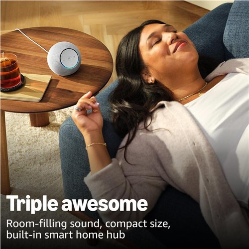 This stylish smart speaker fits beautifully in any space. delivering your personal sound stage with deep bass and enhanced clarity. Listen to your favourite streaming services such as Amazon Music. Spotify and Apple Music. Encore! Subscription fees may apply.