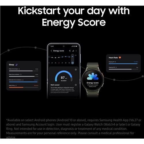 4 Available on select Android phones (Android 10 or above). requires Samsung Health App (V6.27 or above) and Samsung Account login. User must register a Galaxy Watch (Watch4 or later) or Galaxy Ring. Not intended for use in detection. diagnosis or treatment of any medical condition. Measurements are for your personal reference only. Please consult a medical professional for advice.