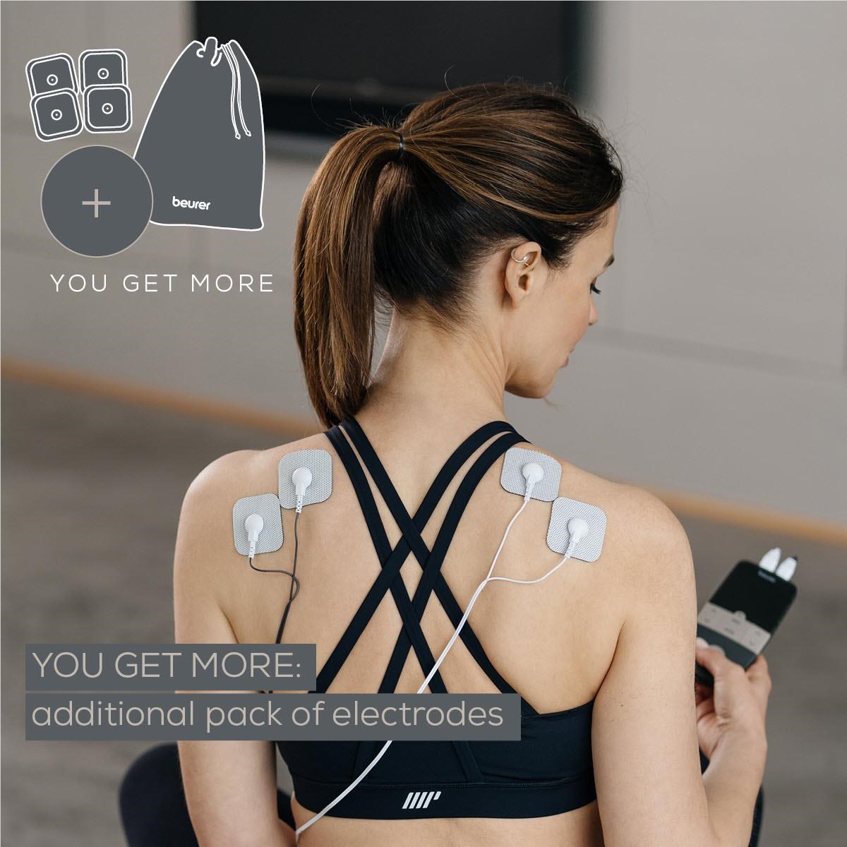 The Beurer EM1R – Digital EMS/TENS device: Luxe Edition features high performance; all natural therapy options coupled with tremendous value and bundled into a luxurious colour casing. Included in the Luxe Edition is a Bonus pack of 4 electrodes (totalling 8 electrodes in pack) and a convenient storage bag to keep the unit well protected between uses.