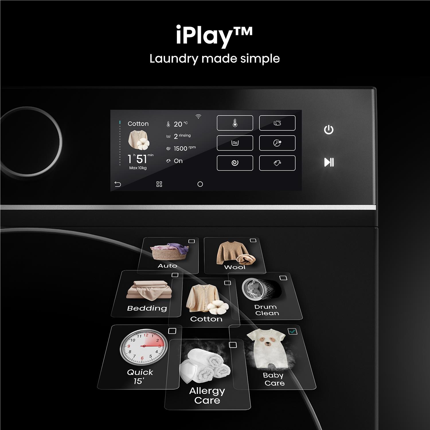 Transforming your Laundry routine with vivid colours and sharp clarity. The 3.55-inch colour screen brings smarter control to your laundry routine. with a vibrant. intuitive display that makes cycle and setting selection effortless. Blending modern aesthetics with functional design. it brings convenience and style to your fingertips.