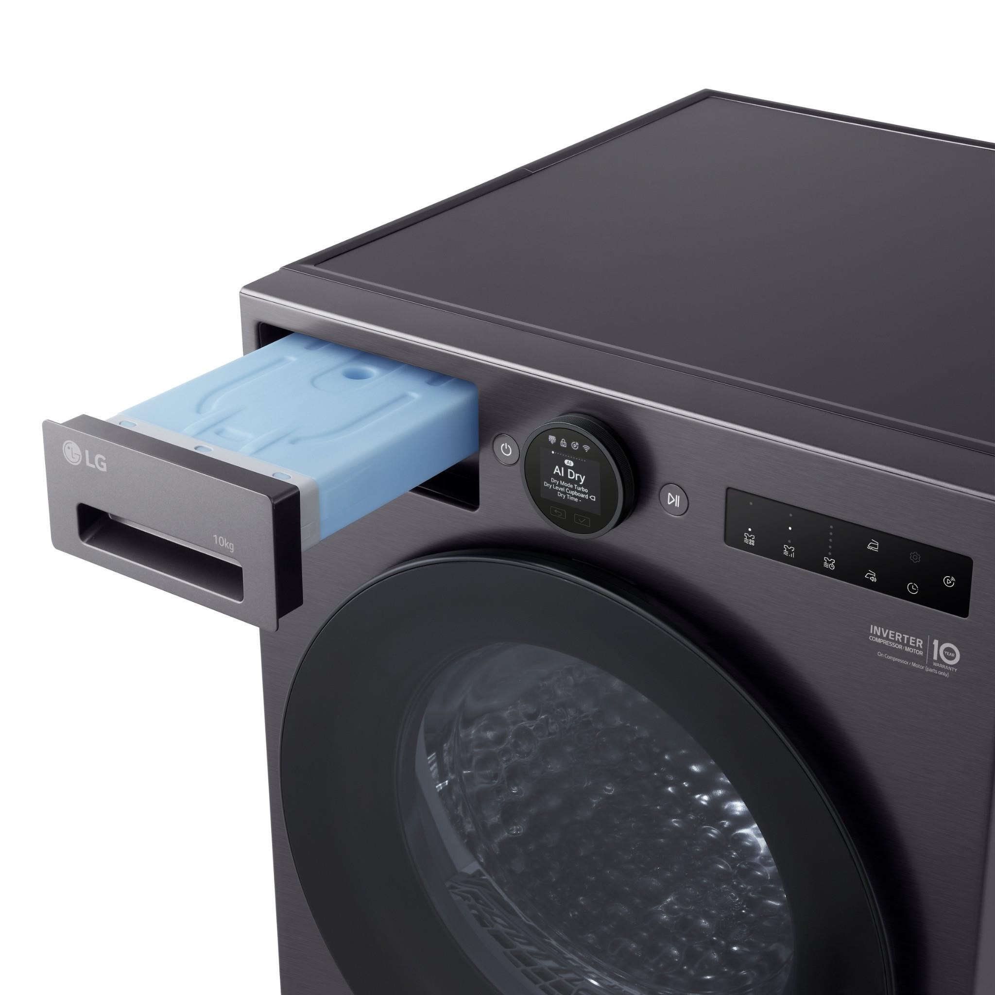 The energy-efficient AI Heat Pump Dryer has low noise. and comes with a 10-year warranty on the Inverter Compresssor Motor.**