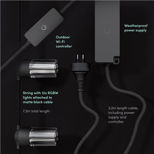 Each string is 7.3m in length with 12 bulbs. This can be extended with an additional 2 strings for a total 21.9m.