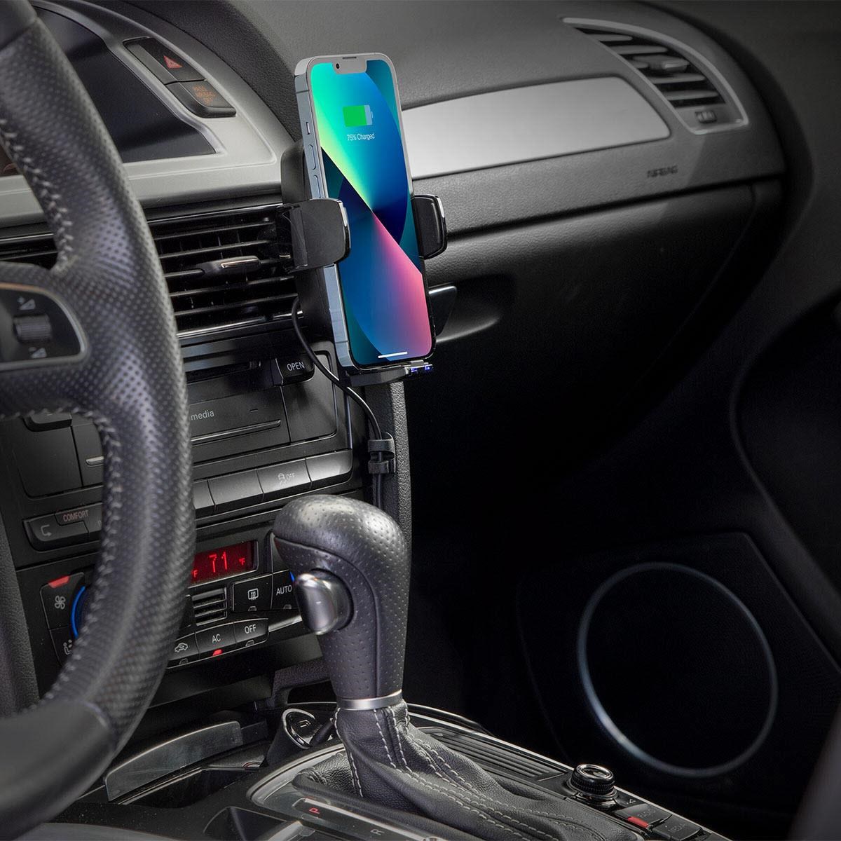 Enjoy the convenience of wireless fast charging using a secure. easy to install. window/dash mount. Or if you prefer. use the included vent mount. With either option your phone remains in full view for safe hands-free use while driving.