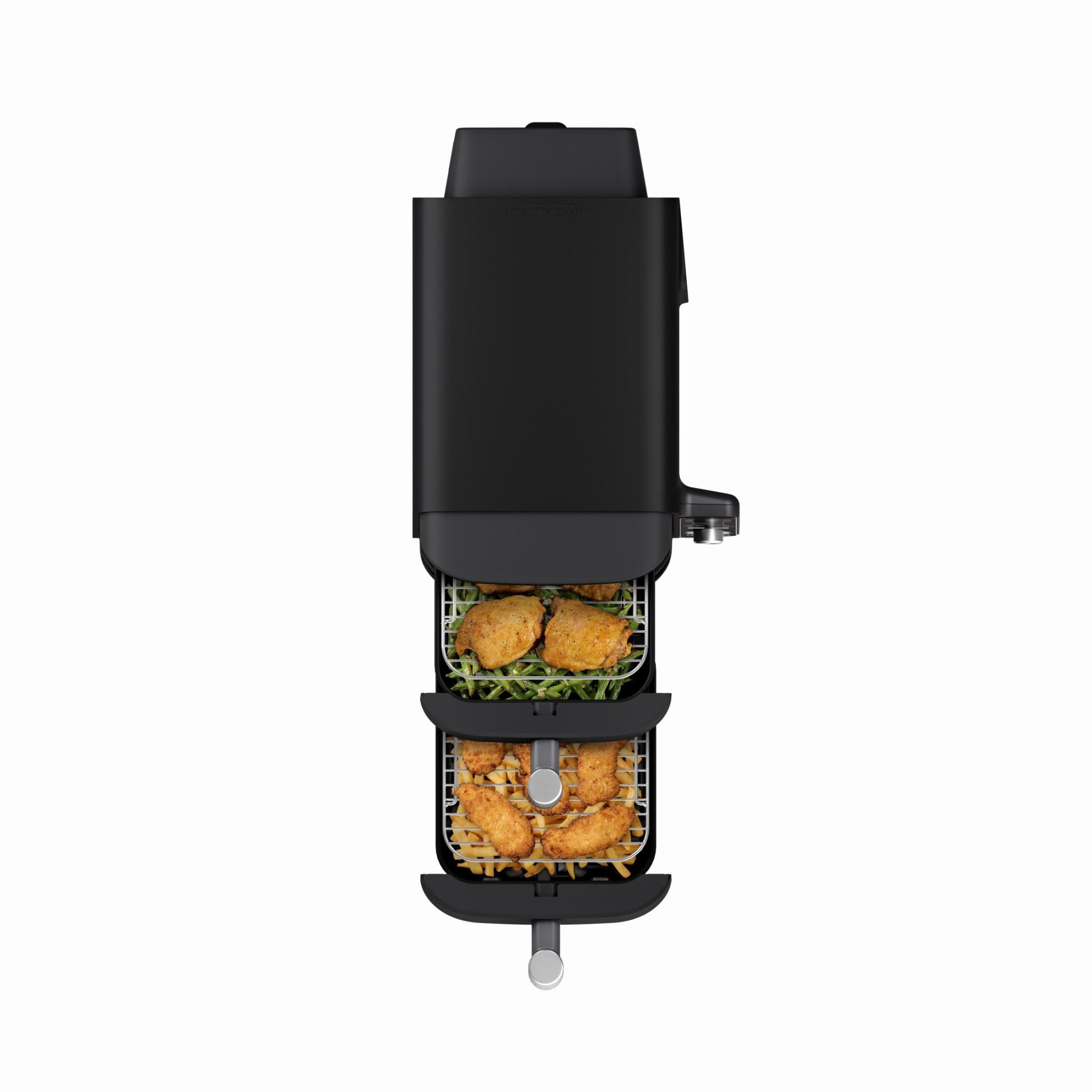 Includes 2 removable stacked meal racks allowing you to cook on 2 levels per drawer. Superheated air surrounds both foods in each basket for an all-around crisp.