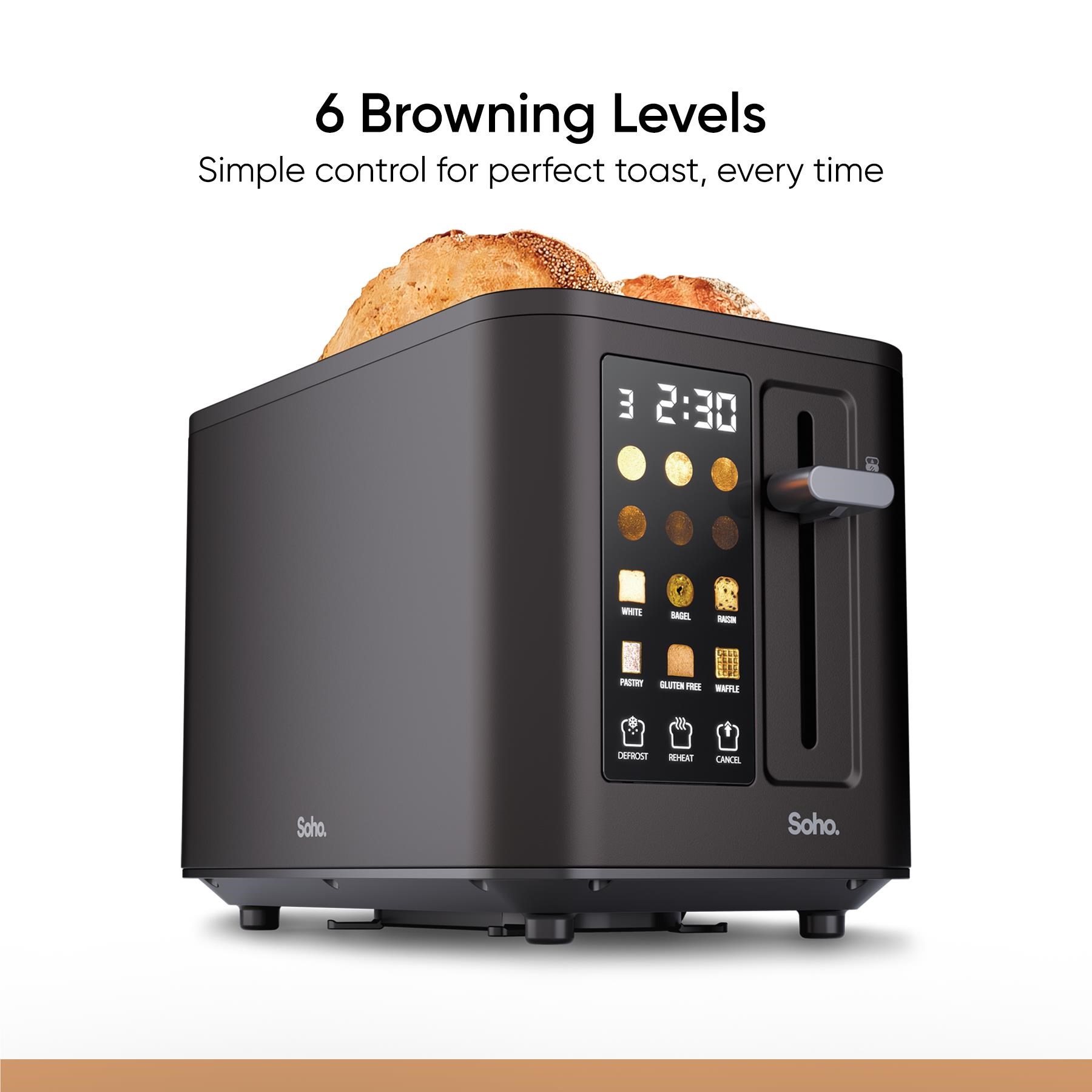 The Soho Slice.2 lets you toast your favourites with elegant ease. Touch controls give access to 12 programs. letting you dial in bread type and your desired browning level. A countdown timer keeps you informed. plus you have defrost or reheat functions. Two wide slots accommodate all kinds of bread while smaller items are retrieved easily with the high lift lever. The Slice.2 is sleekly designed to give you the perfect slice.